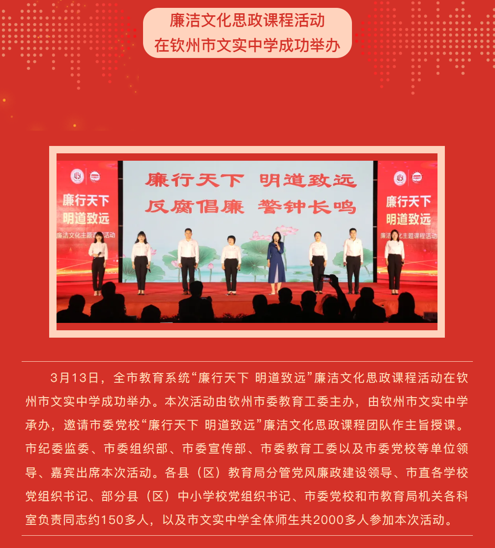 您现在的位置是:首页 > 教育 > 正文 教育 全市教育系统“廉行天下 明道致远”廉洁文化思政课程活动在钦州市文实中学成功举办 2025-03-16 11:00:01教育150 本站部分内容来自互联网公开资料,版权归原作者所有。如有侵权请联系 server-dwz@qq.com 处理。 本文地址:https://www.web3coin.cn/jiaoyu/490.html 下一篇 【悦读】《读懂王力》作者:王西京|朗读:艺媛、孙凯 女:这几年无意中走进中铁一局,却有一种“魂归来兮”的心灵感应,一种似曾相识的人文情结。这个有着“天下第一局”之誉的央企老大,从中华人民共和国成立到改革开放,一路金戈铁马,披荆斩棘,可谓走过了它卓尔不凡的光荣与辉煌之路。 相关推荐 抖赢未来,增长为王 | 福庆家居抖音获客训练营(第二期)圆满成功! 德恩教育:提高记忆力--专注家庭教育与脑力开发 好看又好用!新时代家庭保险配置指南助您“心安为家” 李时珍草本茶饮系列:传承千年智慧,武汉赵上屋商贸打造健康饮品新标杆 巅峰之作 中国大师风范金跃进作品欣赏 海伟股份港股上市日暖心事:海伟股份捐百万援港救灾 读者评论