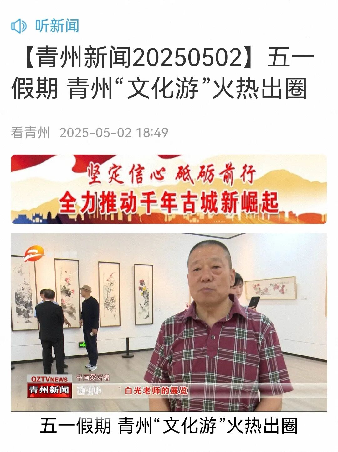 此次展览展出著名画家白光的代表性作品60余幅,是近年来白光艺术世界的一次集中呈现。展览正值五一假期,各地赶来的艺术界、企业界、收藏界等社会各界嘉宾和书画爱好者络绎不绝,对画展给出了高度评价,青州新闻实时播报了展览开幕及后续展览情况,做为了五一假期青州“文化游”重要展览项目。